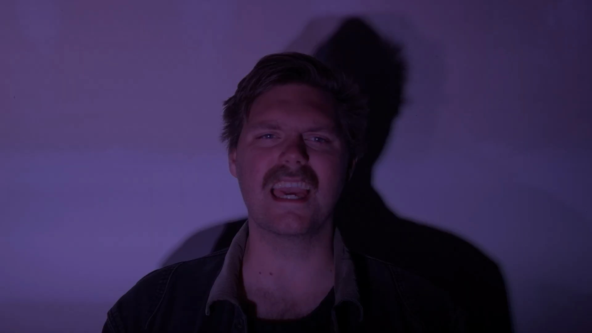 The video, shot and edited by Knifing Around bassist Jack Wolfe, centers on a largely static shot of Martin as lights and hues dance around him, flashing with horror as it quietly builds a sense of creeping dread. Most unsettling is the shadow behind him. At first, it shifts subtly, but slowly grows more erratic, mimicking the unmistakable emergence of a digital double beginning to stir with sentience.