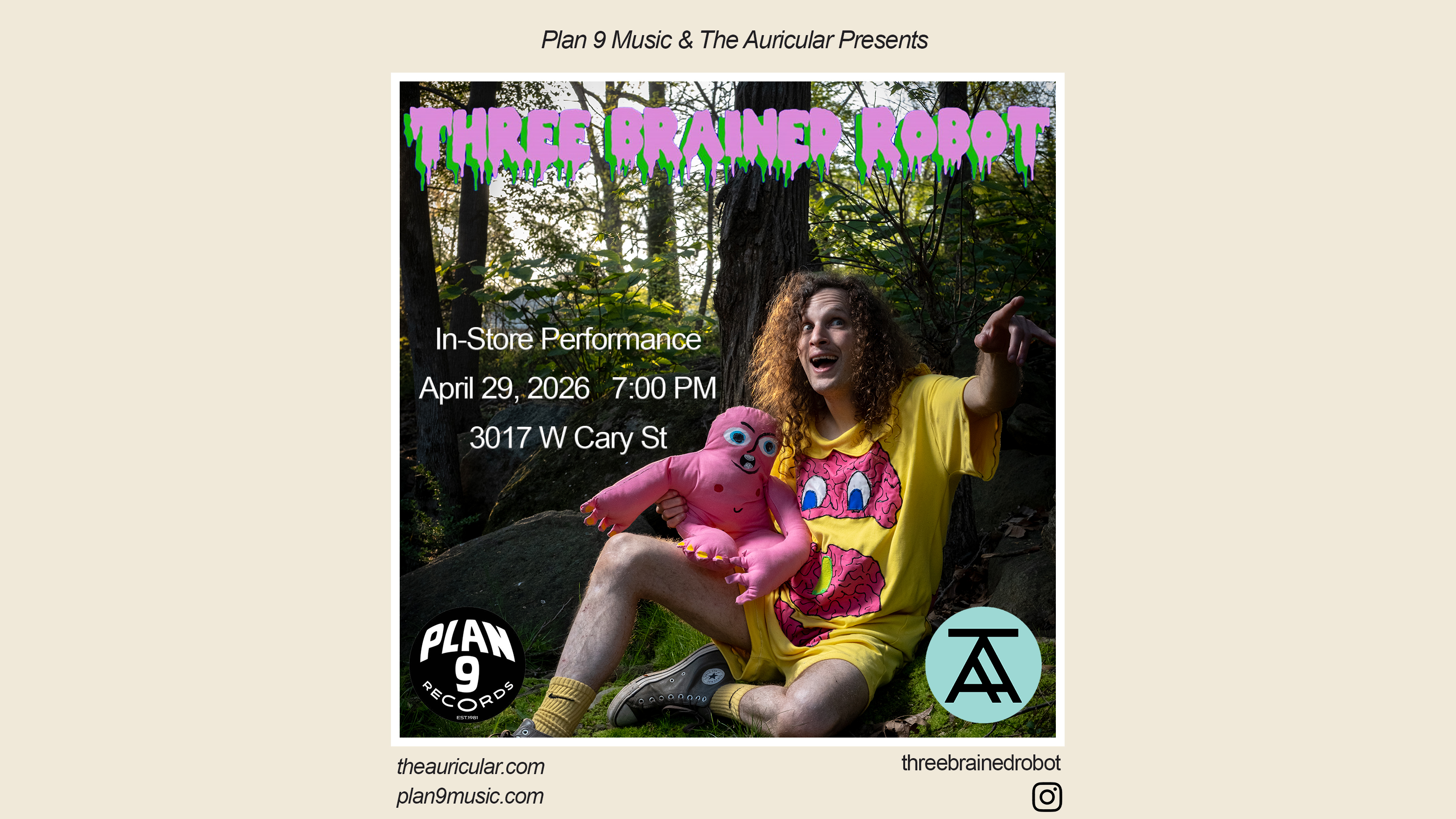 Mark your calendar for Wednesday, April 29 because The Auricular is bringing the musical entity Three Brained Robot to Plan 9 Music for an in-store performance!