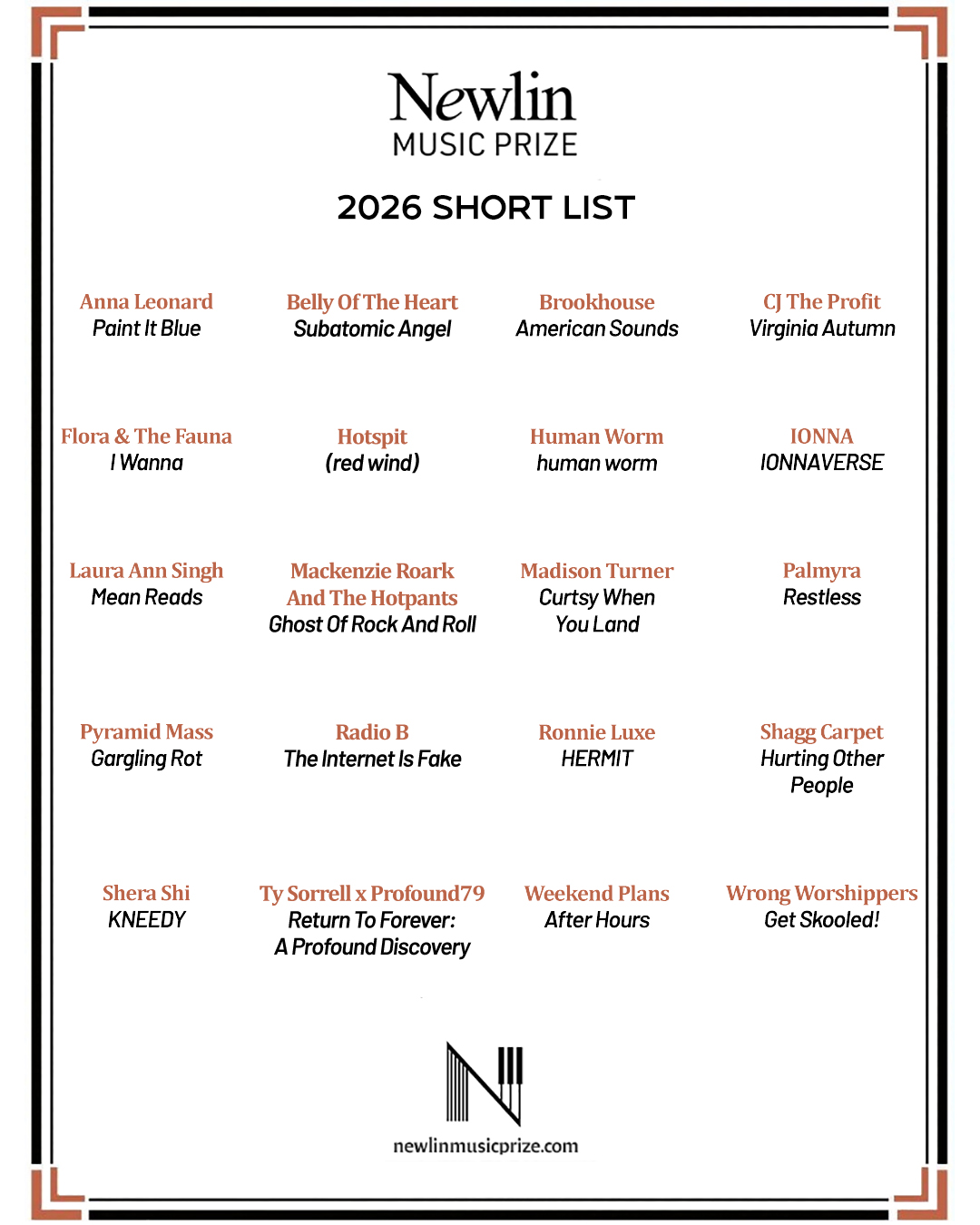 Founded in 2022 and named after musical prodigy, Virginia Commonwealth University professor, and performer Dika Newlin (1923-2006), the Newlin Music Prize is awarded to the best full-length album from the Richmond, Virginia metropolitan area based solely on artistic merit, as decided by members of the local music community and fans. The winner will be announced on March 23, 2026, receiving a commemorative trophy and a $2,500 cash prize. Additionally, each remaining artist on the 2026 Short List will receive $250 in recognition of their work.