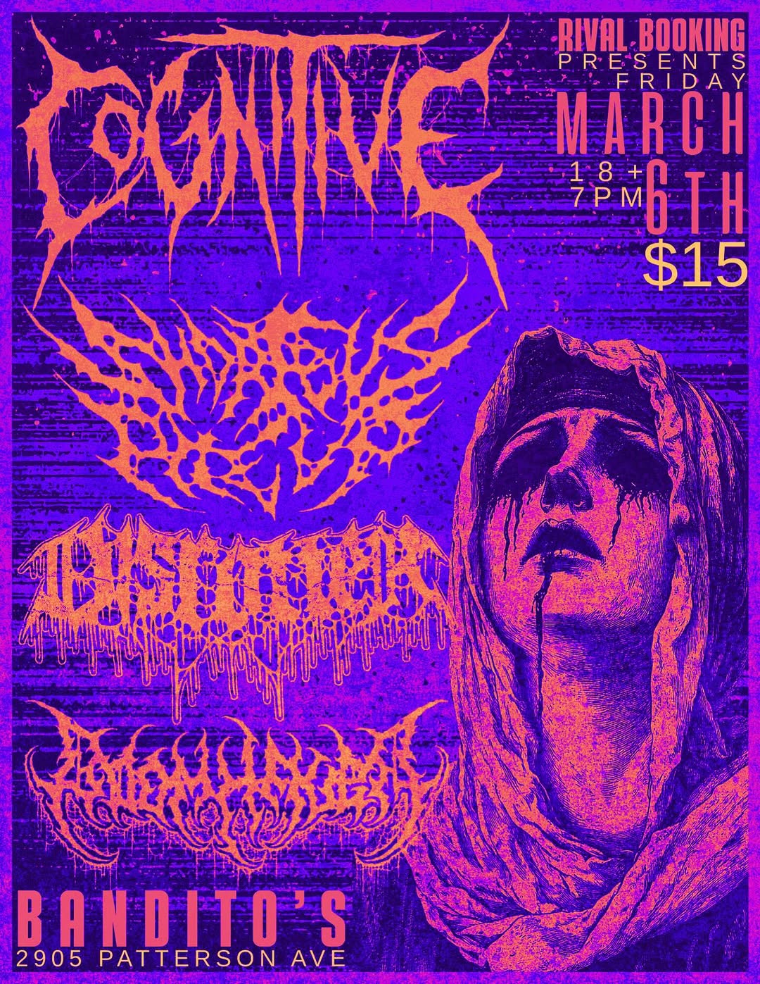 Here’s what Cognitive is: an absolute blazing ripper of a band with an engaging and memorable fascination with melody. Their songs hit hard and scrape across your skin with their malevolence, leaving musical rugburn in their wake. And yet, if you pay close attention, you can hear the subtle education in melody and complex rhythmic arrangements that go into their songs, leaving them at times resembling the almighty Decapitated, while at others, they bring in the straight-up black metal energy of Emperor. It all adds up to something I love a lot, and I expect Cognitive to be even better, more unhinged, and more scathing in person than they even are on recording. And that’s saying something. Virginia-based guttural death metallers Short Bus Pile-Up (whose name, I must admit, is a bit cringe in 2026) are on hand to bring some slam-style low-end mosh to the proceedings, while locals Disrotter roll out some incredibly catchy old-school Florida style death metal to keep all our heads banging. Openers Doomhauer, whose name appears to be a reference to a King Of The Hill character, have that goregrind-ish sample-heavy reference-laden low end rumble sound down pat and will surely get this one off to a raging start. You know what to do.