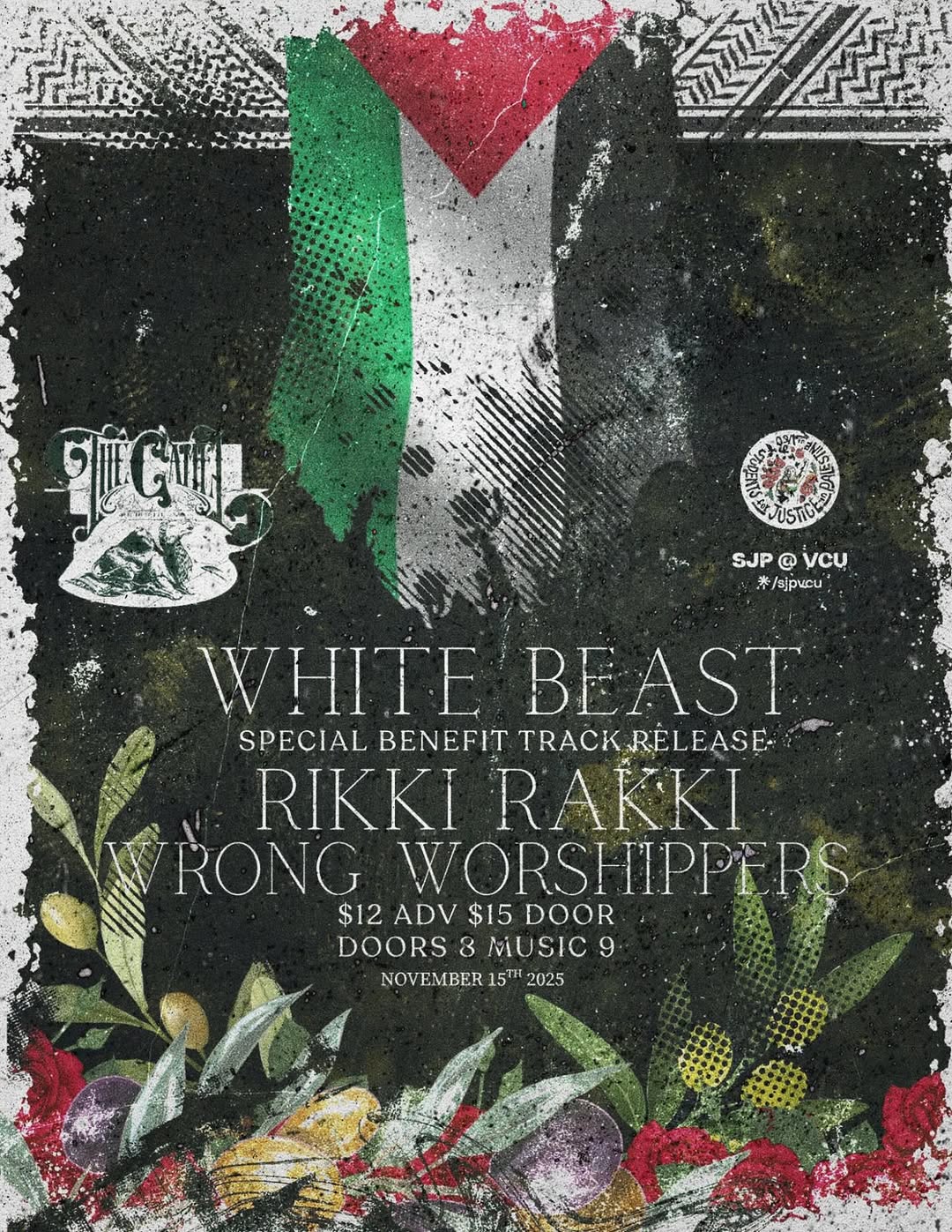 We were talking just a bit ago in this column about how difficult a time in history it is for those who come from Palestine, and only a couple of days later in column-time, here is another show that makes it clear how much those involved in putting it on care and are concerned and upset about the ongoing war in Palestine. This show is a benefit for Students for Justice in Palestine VCU, and its proceeds will help fund SJP VCU’s organizing efforts, including education and community support both overseas and here in Richmond. It won’t just be the show’s proceeds that will go to SJP VCU, either — White Beast will also be releasing a brand new version of “So It Goes,” from their latest EP, Home Alone. The new version will feature guest vocals from Rikki Rakki’s Erika Blatnik and string arrangements by Paul Willson, and all proceeds from that single will also be sent to SJP VCU. These artists care about something more than rocking out and making money — you gotta love that.