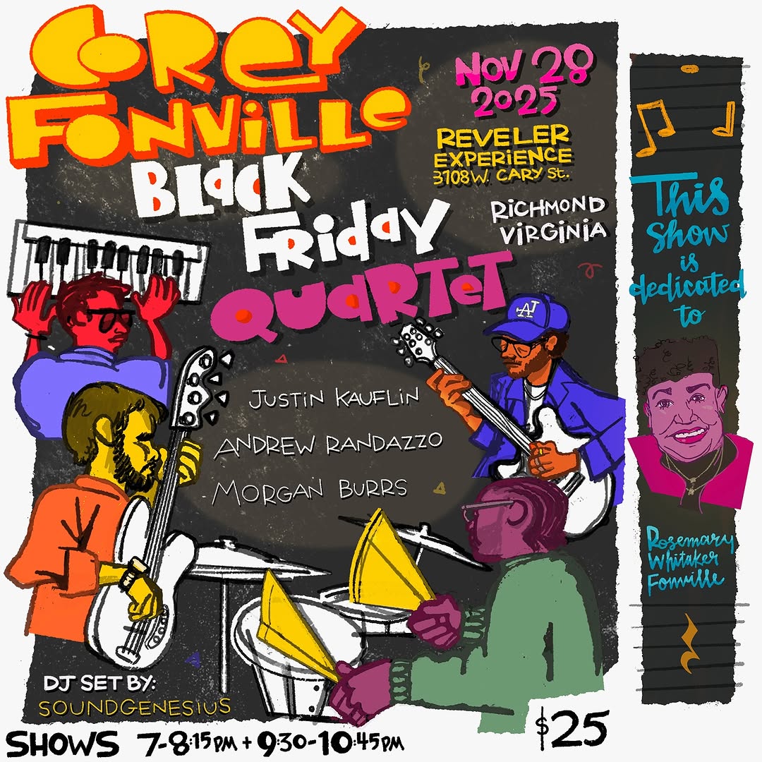 Mega-talented funk-soul-jazz drummer Corey Fonville has been hosting quite a few performances over at Reveler lately in which he acts as bandleader, and if you haven’t caught onto any of them yet, here’s a great opportunity to grab some tickets and catch the jams while a lot of people are still relaxing on mom and dad’s couch in Hampton Roads or NoVA or wherever. Because look — these shows have usually sold out before I even have the chance to consider them for this column. And can it be any surprise? Not only is Corey Fonville the mighty engine that powers world-dominating RVA soul-jazz quintet Butcher Brown, he’s also an incredible player and performer in his own right, releasing incredible material as part of ensembles including folks like Charlie Hunter, Sam Fribush, and Charles Owens. He even played on a Grammy-nominated jazz album: Kurt Elling’s masterful 2023 LP Superblue: The Iridescent Spree.