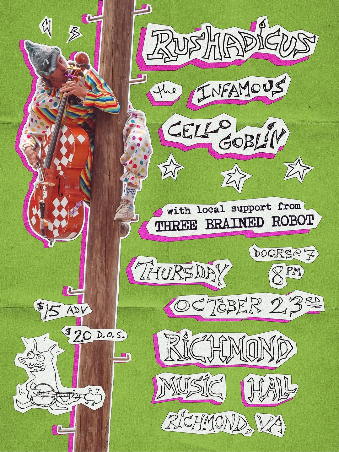 Are you ready for things to get truly, completely wild? Are you ready for a musical performance in which pretty much anything can happen? If so, you definitely want to come out and see Rushadicus The Cello Goblin when he comes to Richmond this Thursday night. I discovered Rushadicus, aka Rushad Eggleston, several years back during the pandemic lockdowns. There were a lot of musicians doing livestreams at the time, but Rushad’s were on another level entirely, featuring him sawing and tapping at his cello in triple-time as he roared and howled incomprehensibly and frequently broke off to play ridiculous solos on the kazoo he had shoved between his tuning pegs. The longer I watched, the more I realized that, not only did this crazy punk-looking goblin kid have a complex mythology behind his semi-gibberish lyrics (every word of which turned out to have an important and complex meaning in Rushad’s made-up language), but he actually had an incredible amount of musical training in his background, and had played everything from classical music to Appalachian folk music to noisy punk rock.