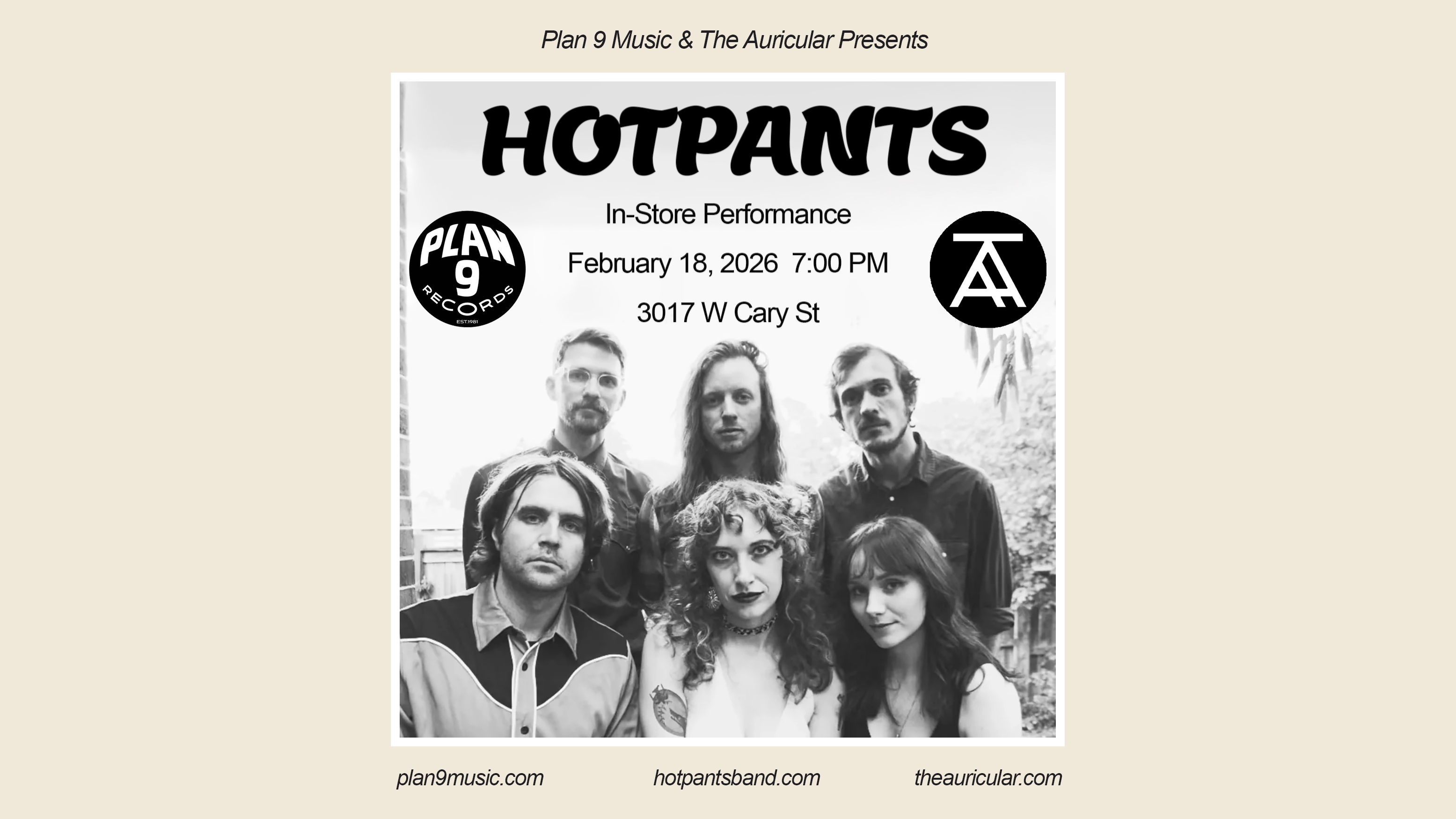 On Wednesday, February 18th, The Auricular proudly welcomes the electrifying sounds of HOTPANTS to Plan 9 Music for an exciting in-store performance!
